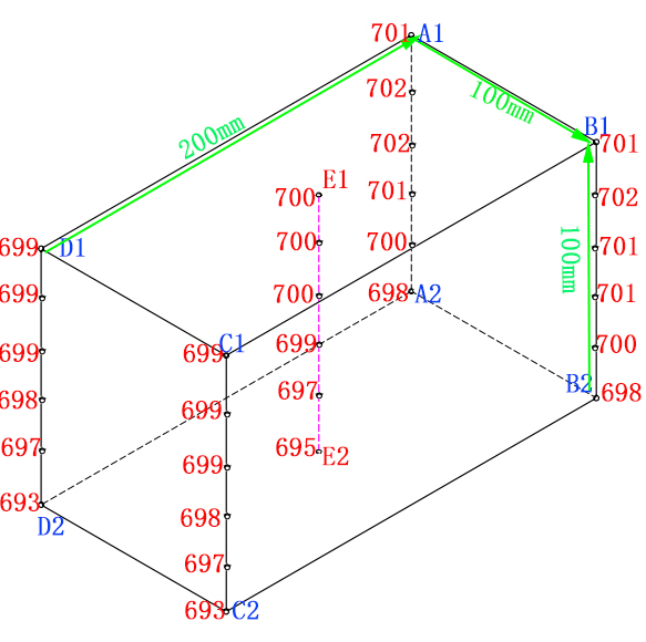 溫場圖 | 在700℃恒溫時的溫場圖 A1BB2A2距離爐膛后墻的距離是5cm B1B2C2C1距離爐膛右墻的距離是5cm C1C2D2D1是爐門方向,距離爐門的距離是5cm A1A2D2D1距離爐膛左墻的距離是5cm A1B1C1D1距離爐頂的距離是5cm A2B2C2D2距離爐低的距離是5cm E1、E2分別是上、下面的中點 此數據僅代表的測試的這一臺,不代表該型號的其它爐子,每臺爐子在裝配生產的過程中會有微小差異,溫場也會有微小的差異 | ||||